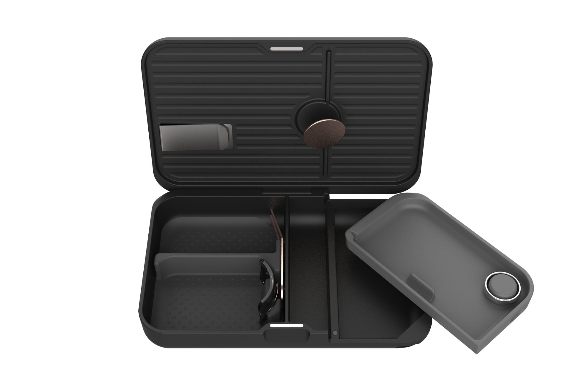 Our innovative Swivel Tray, can be accessed without opening the Lid, and features a clever hidden magnet that aligns it back into place perfectly on closure.
